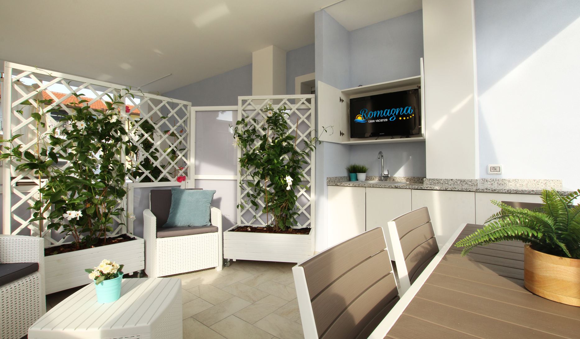Ma la vacanza si vive all’aperto! Ecco allora che il bel loggiato ad uso esclusivo di cui dispone questo appartamento è utilissimo: attrezzato con tavolo e sedie, salottino e tv esterna, è l’ideale per godere delle belle serate, ed avere a disposizione uno spazio in sicurezza per bimbi e pelosi.