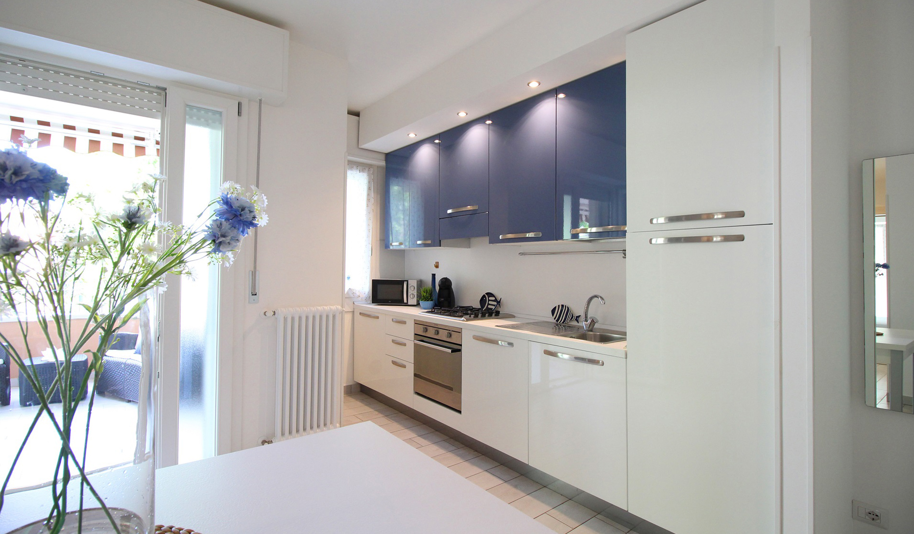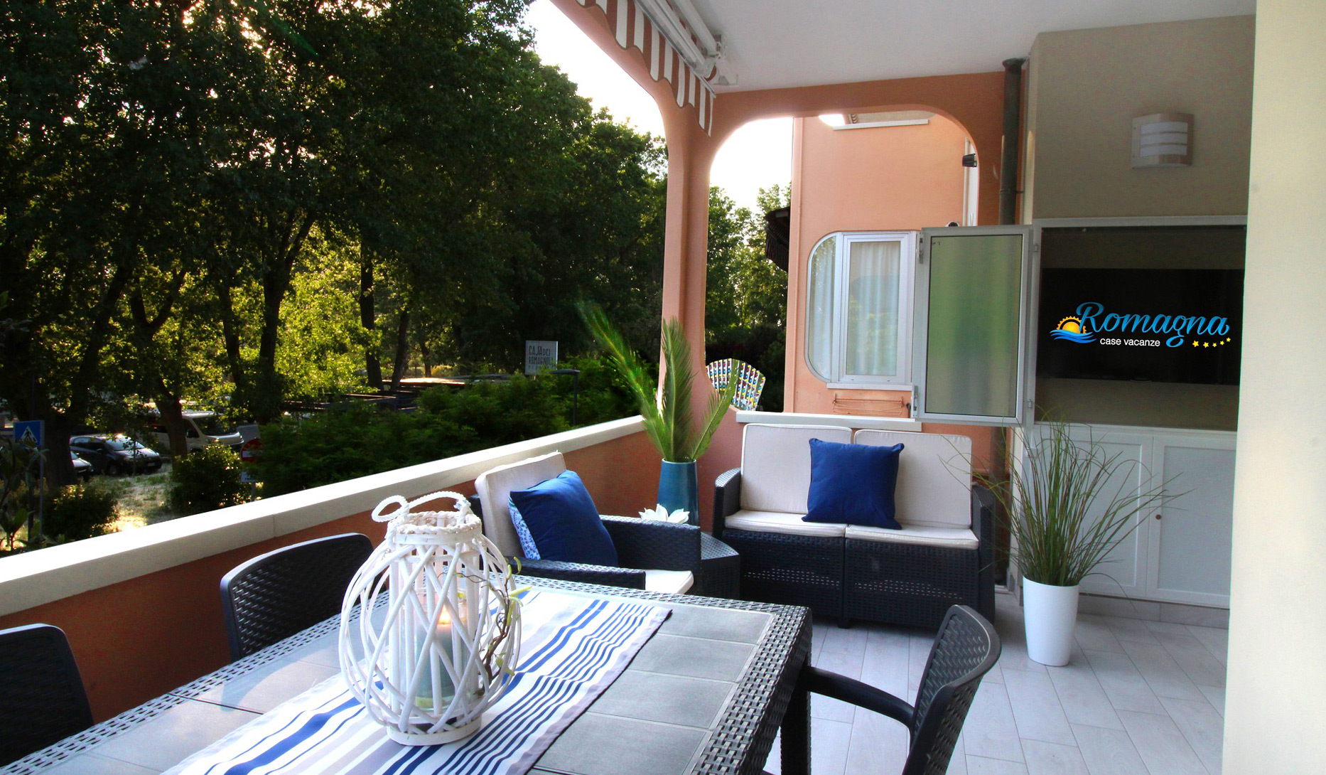 Appartamento al primo piano, vista mare, a 50 mt. dalla spiaggia, di fronte al parco Campana. Gode di un bellissimo ed ampio terrazzo ad angolo attrezzato con lavabo, tv, salottino, tavolo e sedie per godere dell’atmosfera vacanziera.