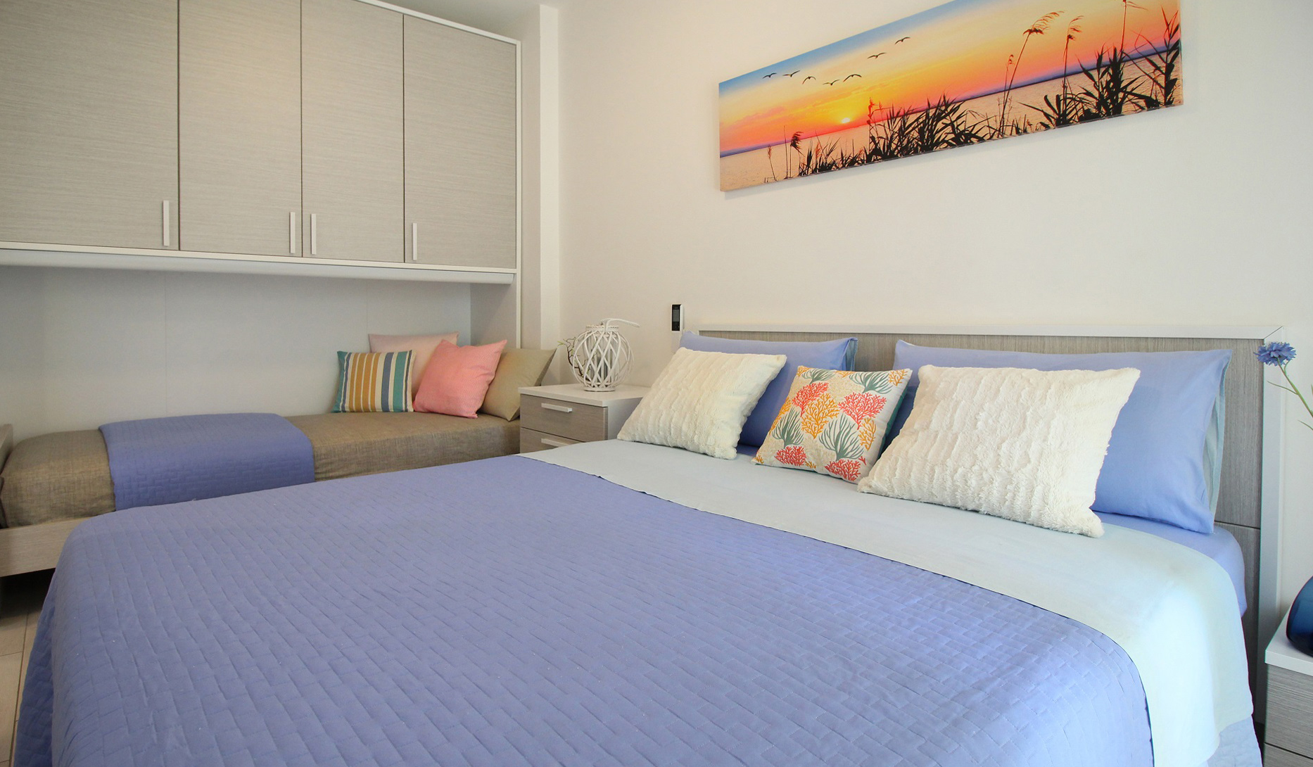 Si compone di: 2 camere matrimoniali di cui una con letto singolo e una con letto a castello. Cucina con divano letto matrimoniale, bagno con box doccia, living e tv esterni. Totalmente ristrutturato, è arredato con gusto e con tutti i confort. Ideale per famiglie con bambini, o per chiunque voglia godere della perfetta posizione per raggiungere velocemente la spiaggia, o per godersi gli eventi serali organizzati nel parco e sul lungomare.