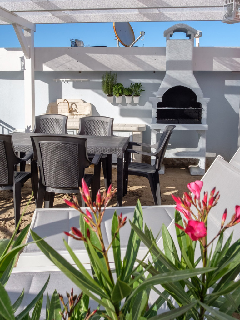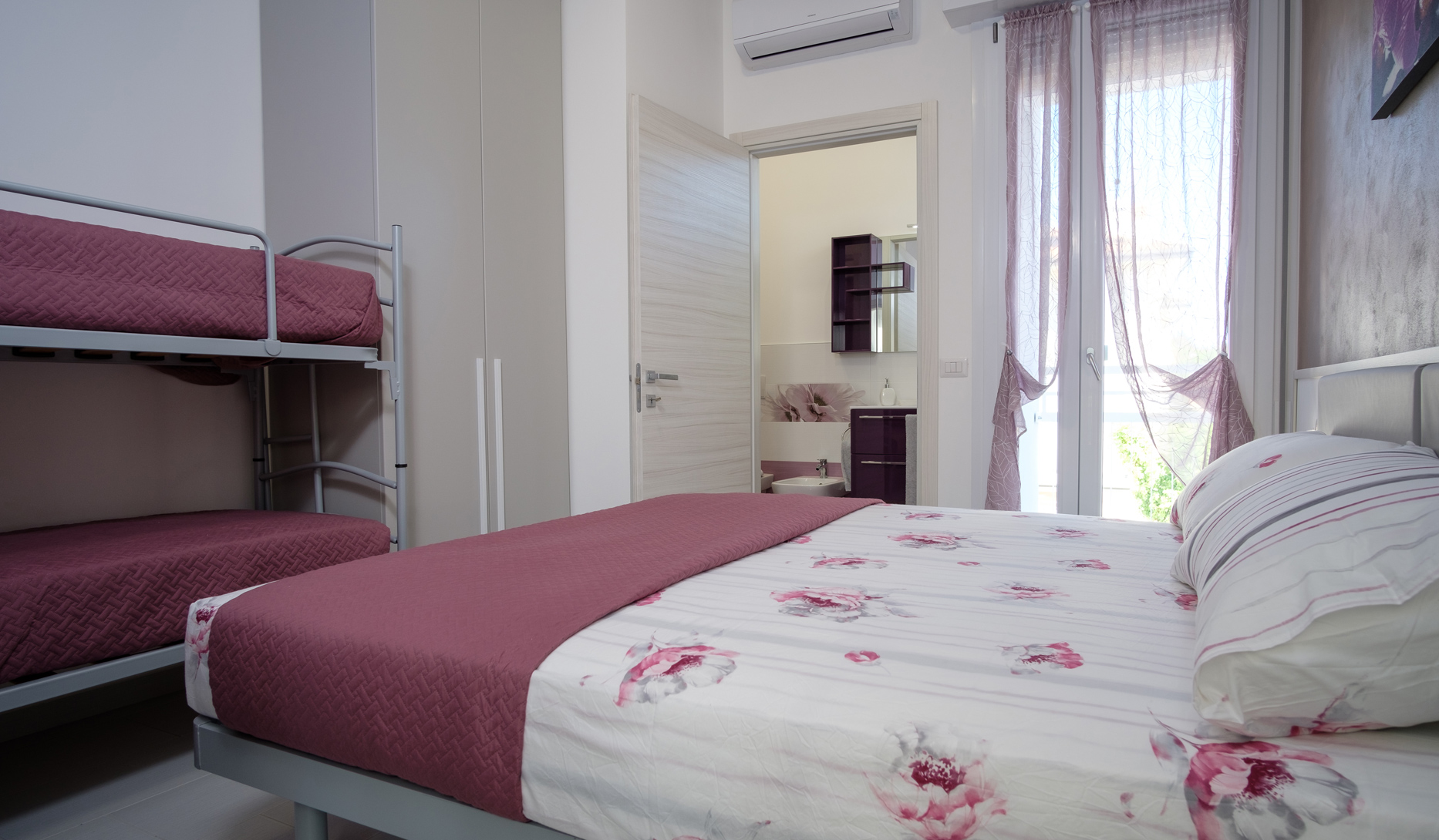 E’ composto da zona giorno, 2 camere (una matrimoniale e una matrimoniale + letto a castello), 2 bagni privati con box doccia. Ha il giardino, di sabbia, in uso esclusivo, dove sono posizionati tavolo, sedie e barbecue, per organizzare grigliate all’aperto. La cucina, in legno laccato a poro aperto, dispone dei più moderni elettrodomestici (piano cottura ad induzione, lavastoviglie, lavatrice, microonde, etc.…).