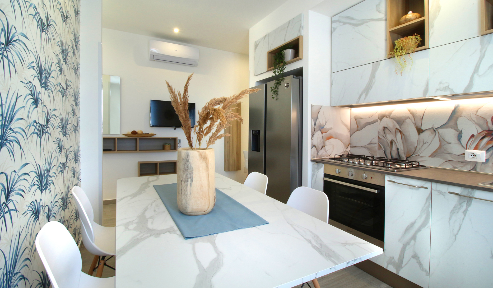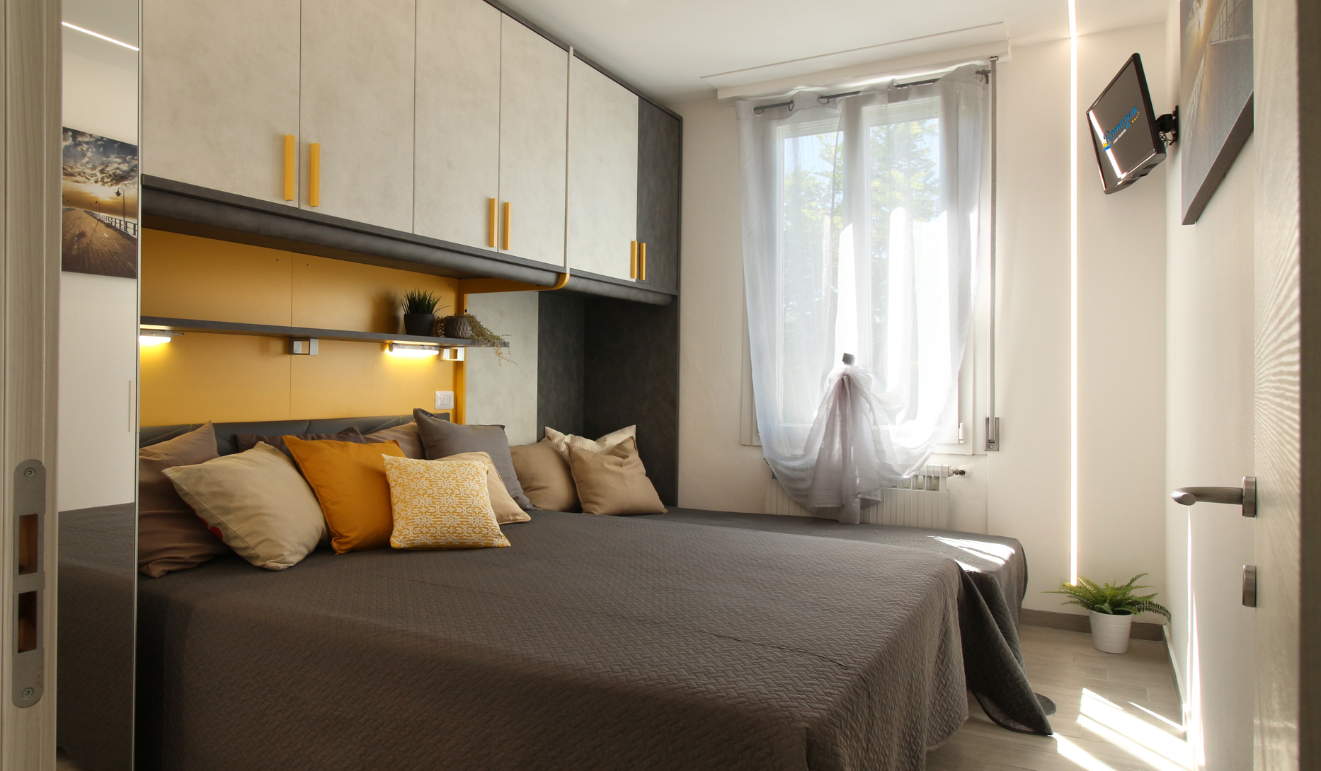 Si compone di: 2 camere matrimoniali, di cui una con letto a castello e una con terzo letto singolo. Cucina con frigo americano, con dispenser di acqua e ghiaccio. E’ dotato di due posti auto all’interno del recinto.