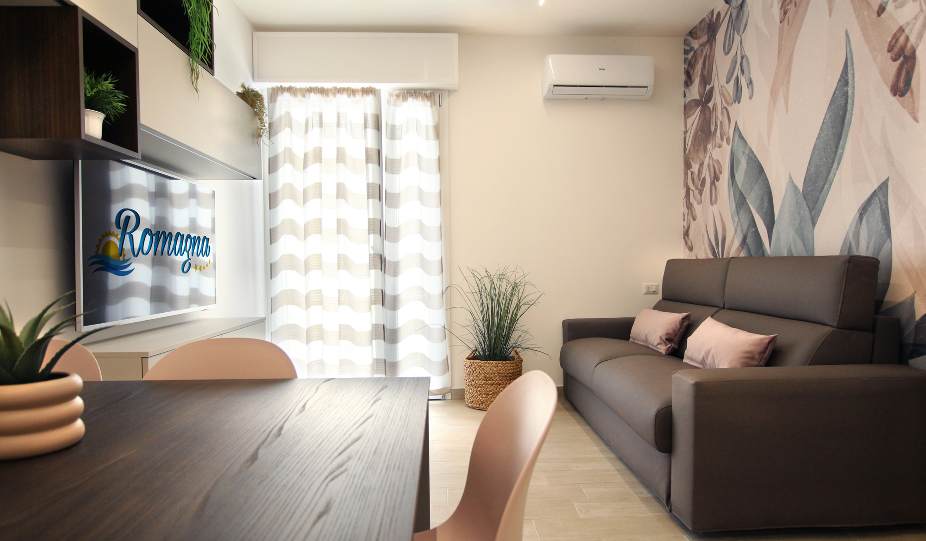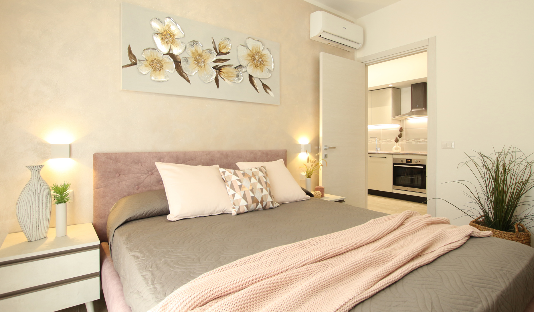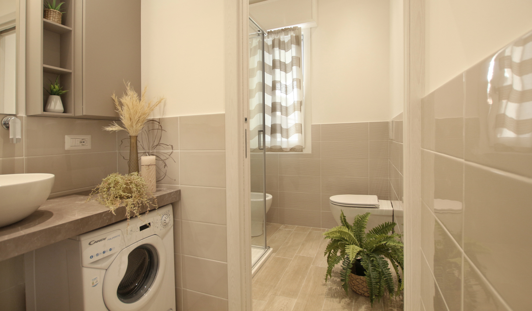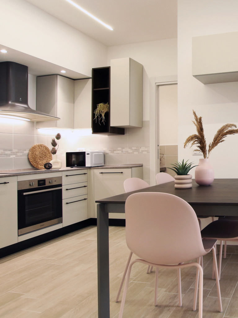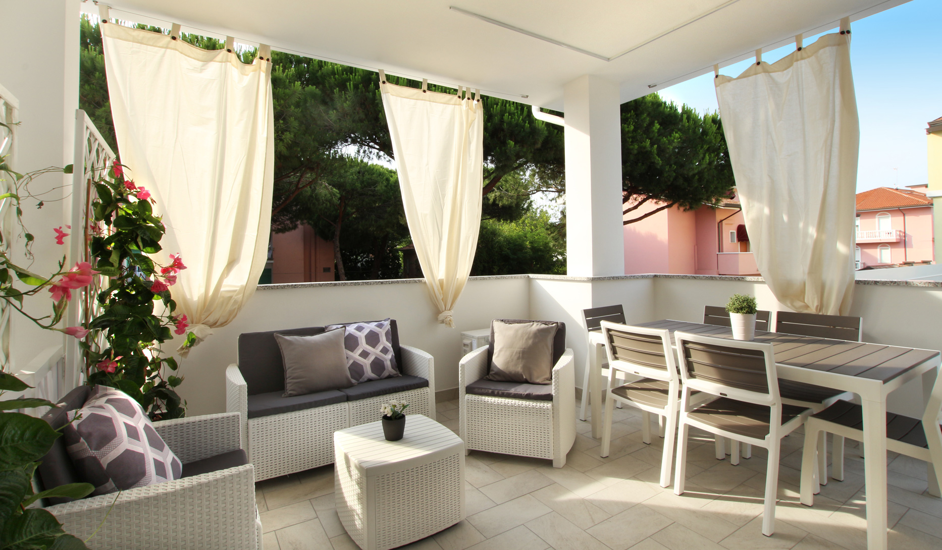 Sia la zona giorno che la camera da letto hanno la portafinestra, da cui si accede al loggiato ad uso esclusivo, attrezzato con tavolo e sedie, salottino e tv esterna, per poter cenare all’aperto, e godere delle belle serate estive.