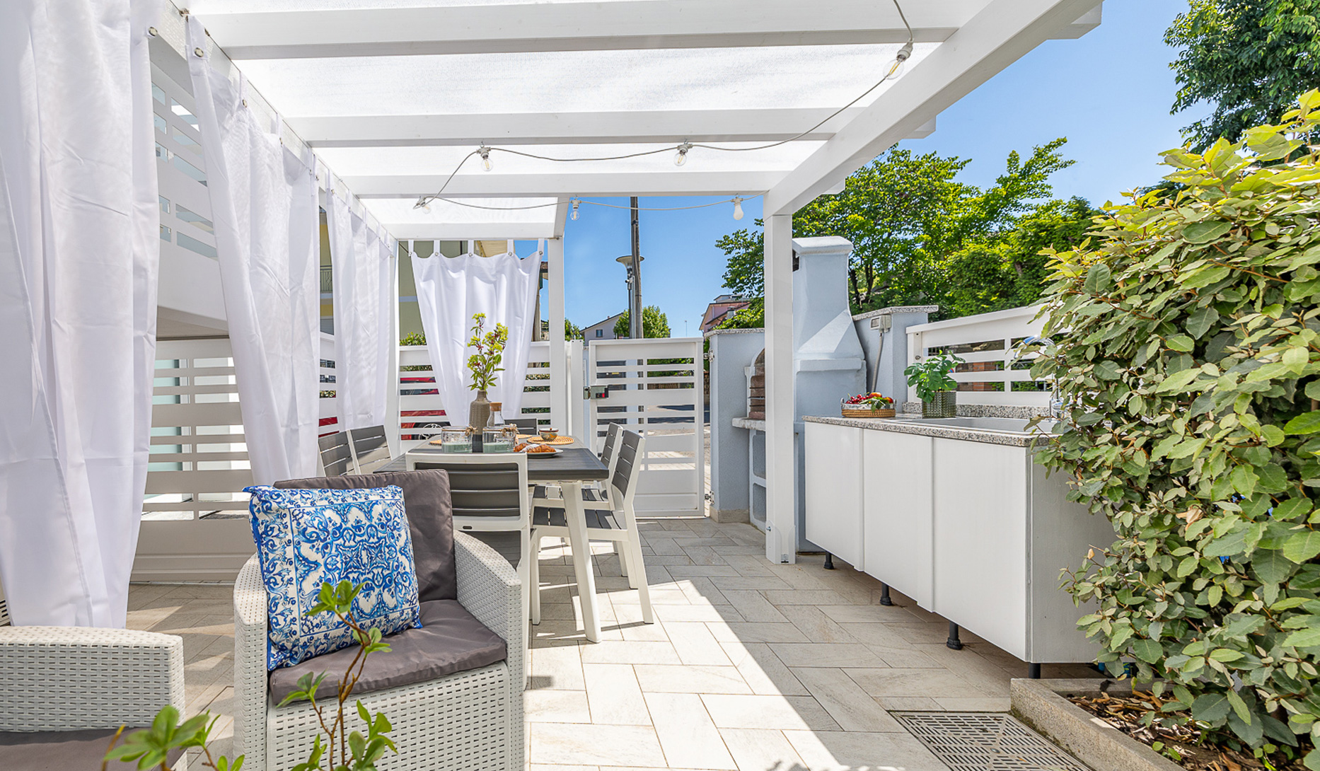 Ognuna delle due camere da letto ha il proprio bagno in camera. Il fiore all’occhiello di questo bellissimo appartamento è però la sua area esterna esclusiva di 50 mq, attrezzato con Jacuzzi, lettini prendisole, living esterno e il comodissimo barbecue per grigliate in compagnia… un vero paradiso!